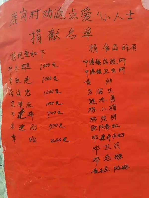 中港鎮鹿崗村愛心人士為勸返點捐贈資金和食品的事蹟上了紅榜