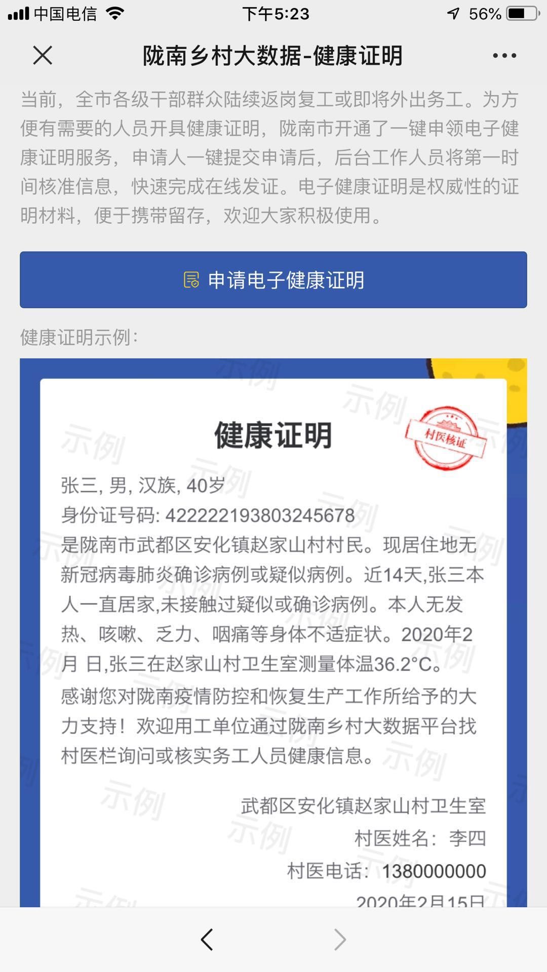 “電子健康碼”是隴南市為進一步方便外出務工人員等有需要的人員開具健康證明,利用鄉村大數據平台開發的線上證明功能。申請人在隴南鄉村大數據平台一鍵提交申請後,後台工作人員第一時間核准信息,快速完成在線發“碼”。隴南電子健康碼具備便捷、通用以及權威性。