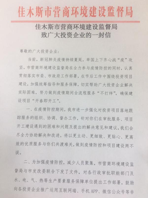 為攜手企業共同打贏疫情防控阻擊戰,佳木斯市推出了致廣大投資企業的一封《公開信》,表達為各投資企業解決實際困難提供優質服務強烈意願。信中還詳細介紹了辦理各項業務的多種渠道,推出了容缺受理、集中會辦、聯合會商、領辦幫辦等服務新舉措。對百大項目和招商引資項目本着急事急辦、特事特辦的原則,採取網上辦、預約辦、現場辦相結合的方式,滿足廣大投資企業在疫情防控期間的政務服務需求。
