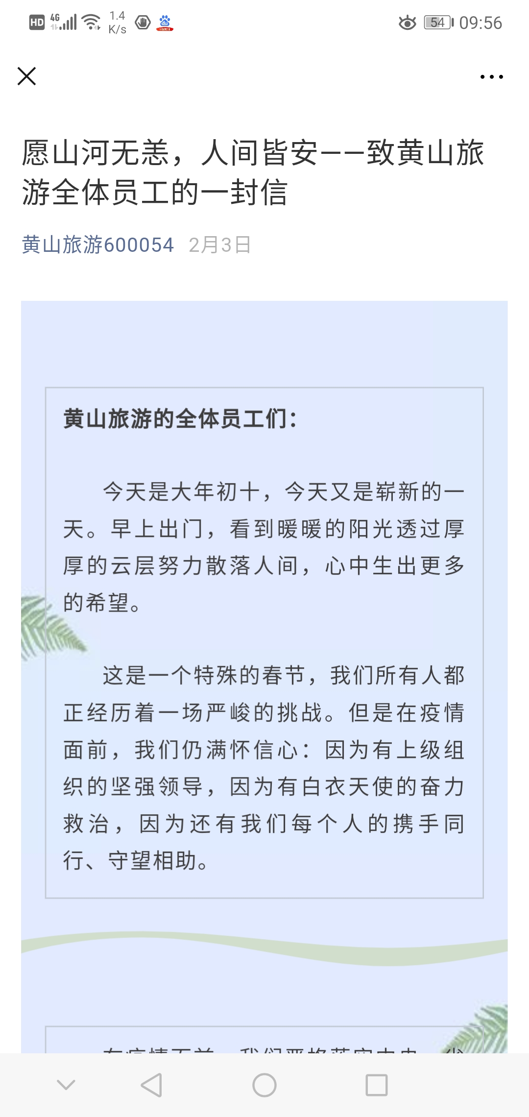 在《致黃山旅遊全體員工的一封信》中寫道:只要我們堅定信心、萬眾一心,只要我們科學防控、眾志成城,一定能取得最終的勝利。