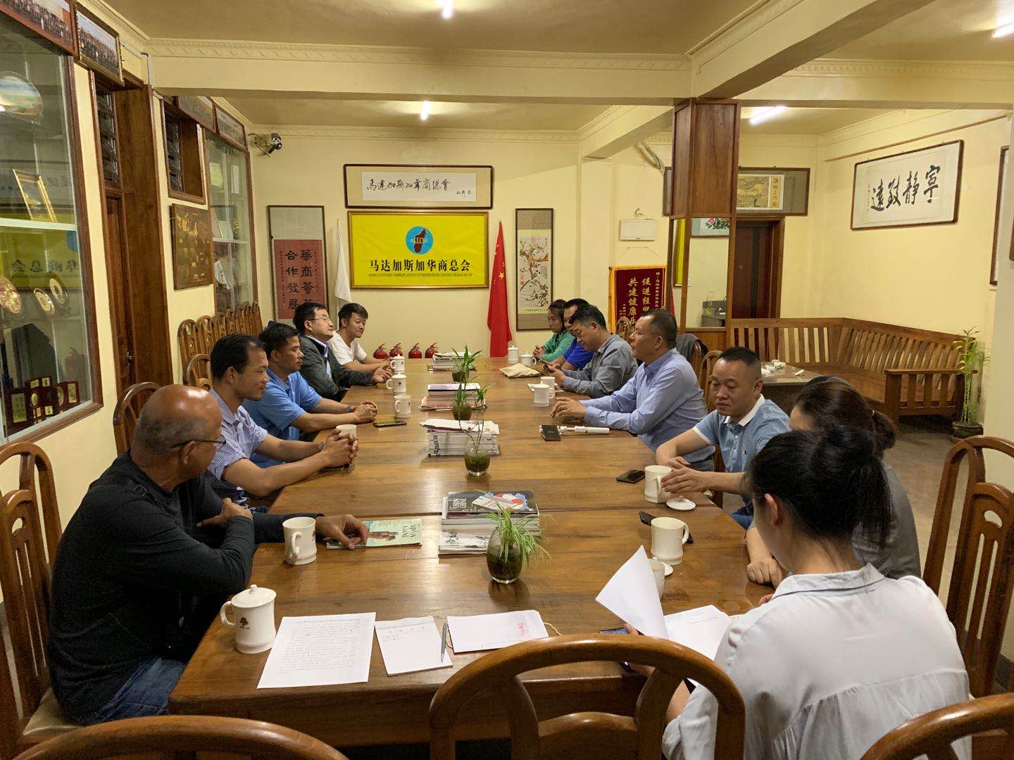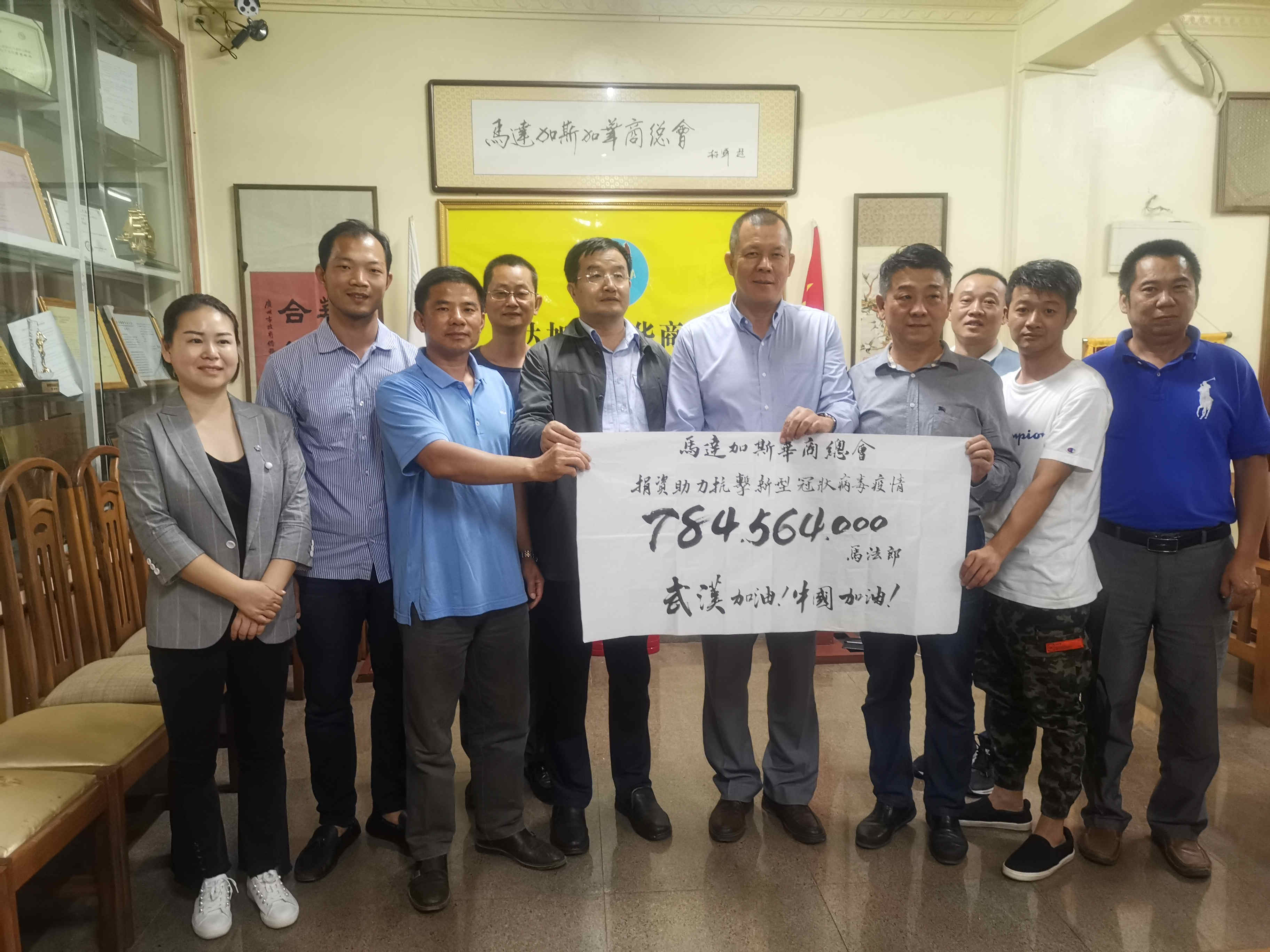 2020年2月19日晚,馬達加斯加華商總會在蔡國偉會長的組織下,華商總會緊急召開了會長團會議。由輪值會長商良主持,常務副會長任瑜傑、王宏偉,倫永坤、副會長廖騰彪、蔡金鋼、黃志遠、楊亞爐、FDC公司劉雪蘭代表等人出席。會議決定,向祖國捐資784564000馬法郎(摺合人民幣288888元)。