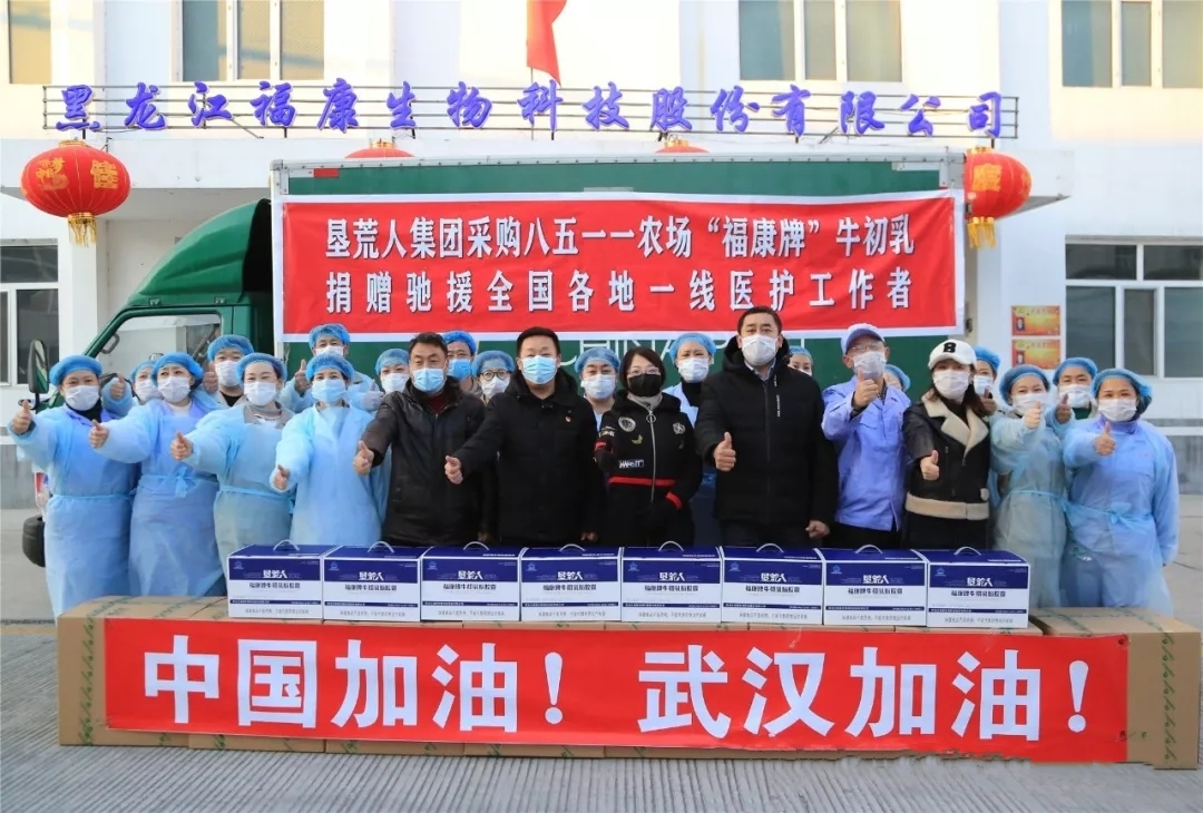 【香港商報網訊】2月19日是黑龍江福康生物科技股份有限公司復工生產的第一天,公司在做好疫情防控的基礎上,加緊生產出墾荒人集團訂購的500箱市值近300萬元的「福康牌」牛初乳產品。而墾荒人集團作為黑龍江省八五一一農場有限公司「福康牌」牛初乳產品的獨家代理銷售商,更是以遍布全國26個省市(區)的300多家實體尅店為依託,將這批愛心產品捐贈給全國各地一線醫務工作者,向奮戰在抗「疫」一線的「白衣衛士」致敬!農場黨委副書記杜秀華、副場長亓力與公司員工共同見證了這一暖心時刻。
