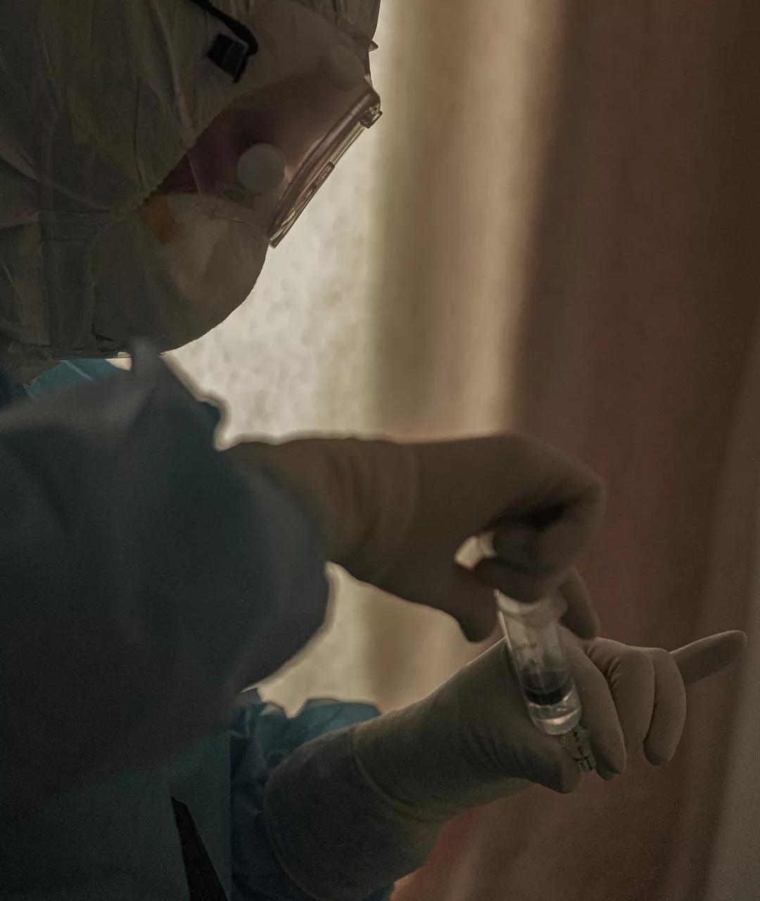 工作了一個多小時之後,護目鏡開始「起霧」,這會極大地影響楊佳慧的工作效率。一套防護服的有效防護時間是4-6個小時,她必須在這段時間內,完成所有的工作。