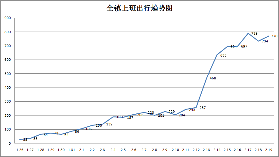 在各村的每日村民出行趨勢圖上,有累計、上班、購物、就診、其他共五條曲線,曲線峰值低的,說明村民外出少,管控措施得力,曲線峰值高的,說明這類出行人員還有現實需求,各村要立即找差距看不足,馬上改進。通過這幾條折線,分析出行變化,從而對出行原因比較集中的人群採取更具針對性和可操作性的措施進行管理。而「累計」這條曲線則是為全面把握出行村民的總體情況,對封村以來出行村民數據進行匯總分析,依據曲線波動和關鍵轉折點,全面分析鎮域防控工作的難點和重點,通過動態監測、分析,不斷調整相應的防控措施,使全鎮疫情防控工作更加有序、有力、有效。