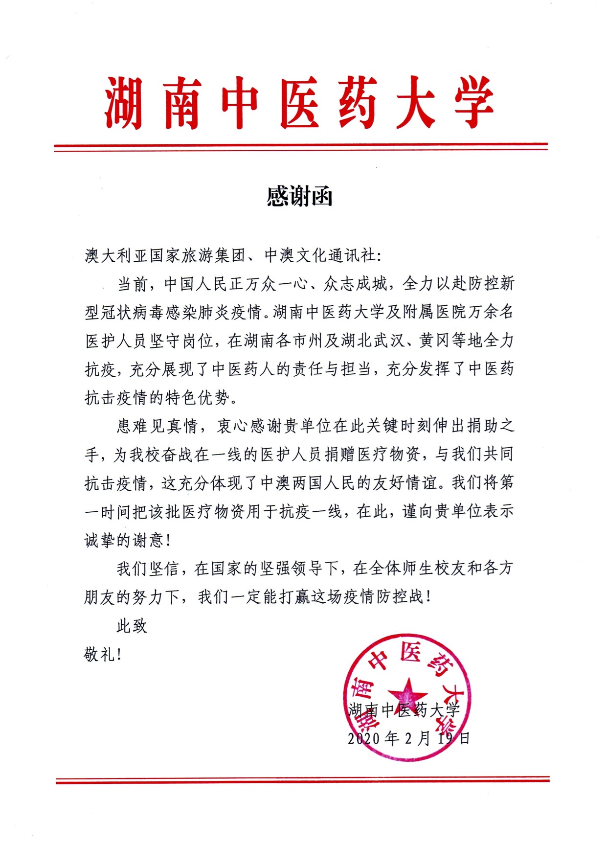 「患難見真情,衷心感謝你們在關鍵時刻伸出援助之手!」湖南中醫大學黨委書記秦裕輝代表一線醫務人員對澳大利亞國家旅遊集團和澳中傳媒通訊社的大愛表示感謝。據悉,疫情發生後,湖南中醫藥大學於迅速成立以黨委書記秦裕輝、校長戴愛國為組長的新型冠狀病毒感染的肺炎防控工作領導小組。國醫大師熊繼柏臨危受命擔任湖南省新冠肺炎中醫救治專家組顧問,該校20餘名專家下沉到湖南14個市州指導並參與中醫防治工作。國醫大師劉祖貽與學校11名專家迅速研發防疫中藥預防處方,由湖南省中醫藥管理局正式公布推廣,為老百姓防控新冠肺炎疫情再添一道屏障。目前,湖南中醫藥大學及附屬醫院的近萬名醫護工作者奮戰在防疫最前線,其中105名業務骨幹已分批前往湖北武漢、黃岡等地進行醫療救援。