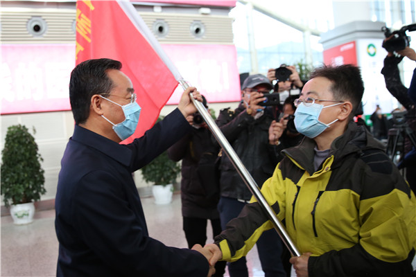 甘肅省長唐仁健為援鄂醫療隊授旗