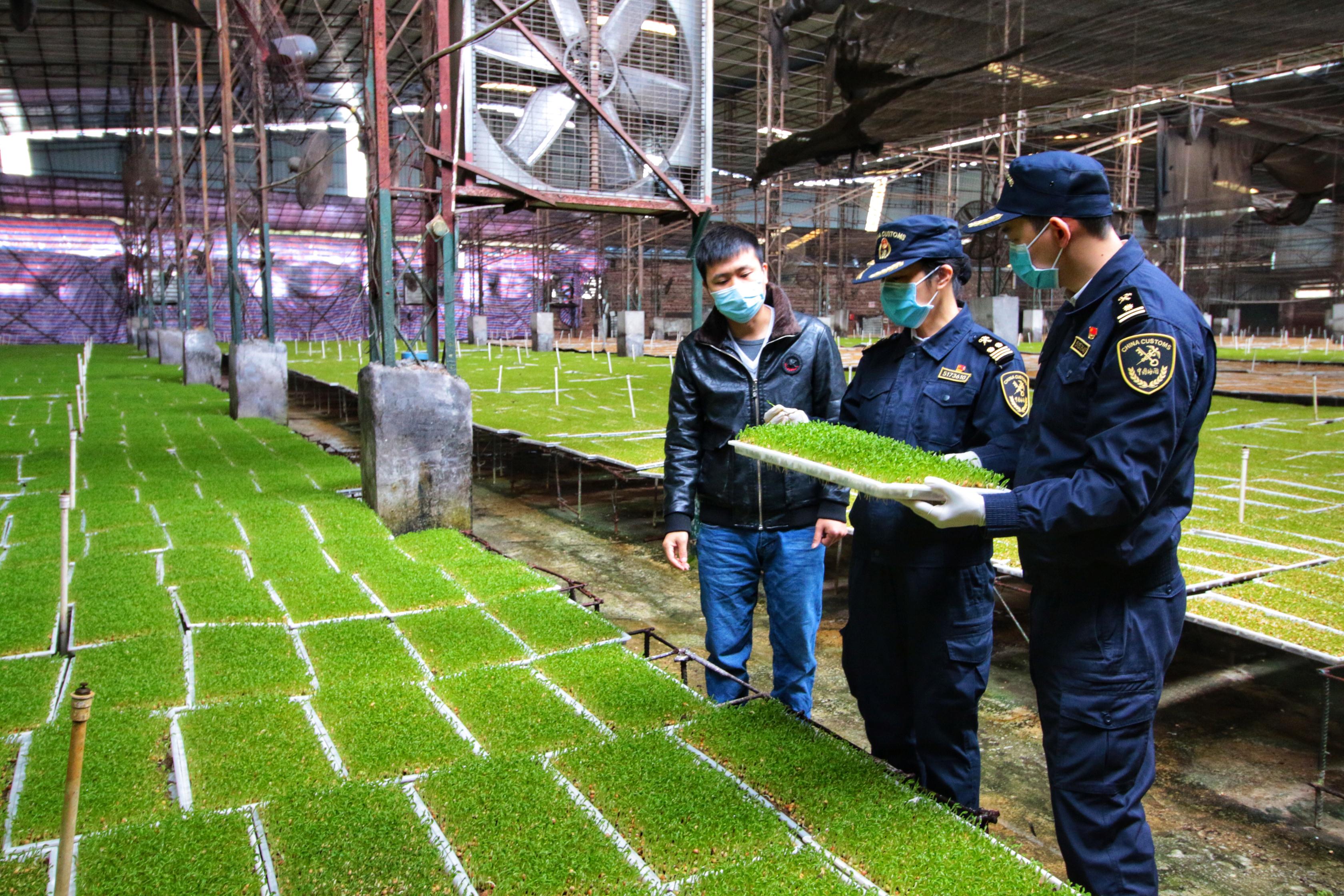 佛山海關駐三水辦事處關員對出口種苗進行現場檢疫查驗