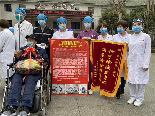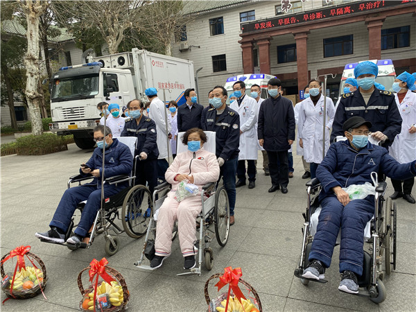 出院患者資料:覃某某,男,83歲,於2月8日在感染科三病區住院治療,確診為新冠肺炎(危重型)並轉入綜合ICU 病房進一步治療。經新冠肺炎專家成員會診制定治療方案治療後患者病情平穩,於 2 月 20 日轉入感染科三病區繼續隔離治療。治療後該患者連續多日體溫正常,連續三次核酸釆樣陰性,複查胸部CT顯示雙肺滲出性病變顯著改善。根據《新冠肺炎第六版指南》,且經醫院新冠肺炎專家會診評估,患者已達出院標準。