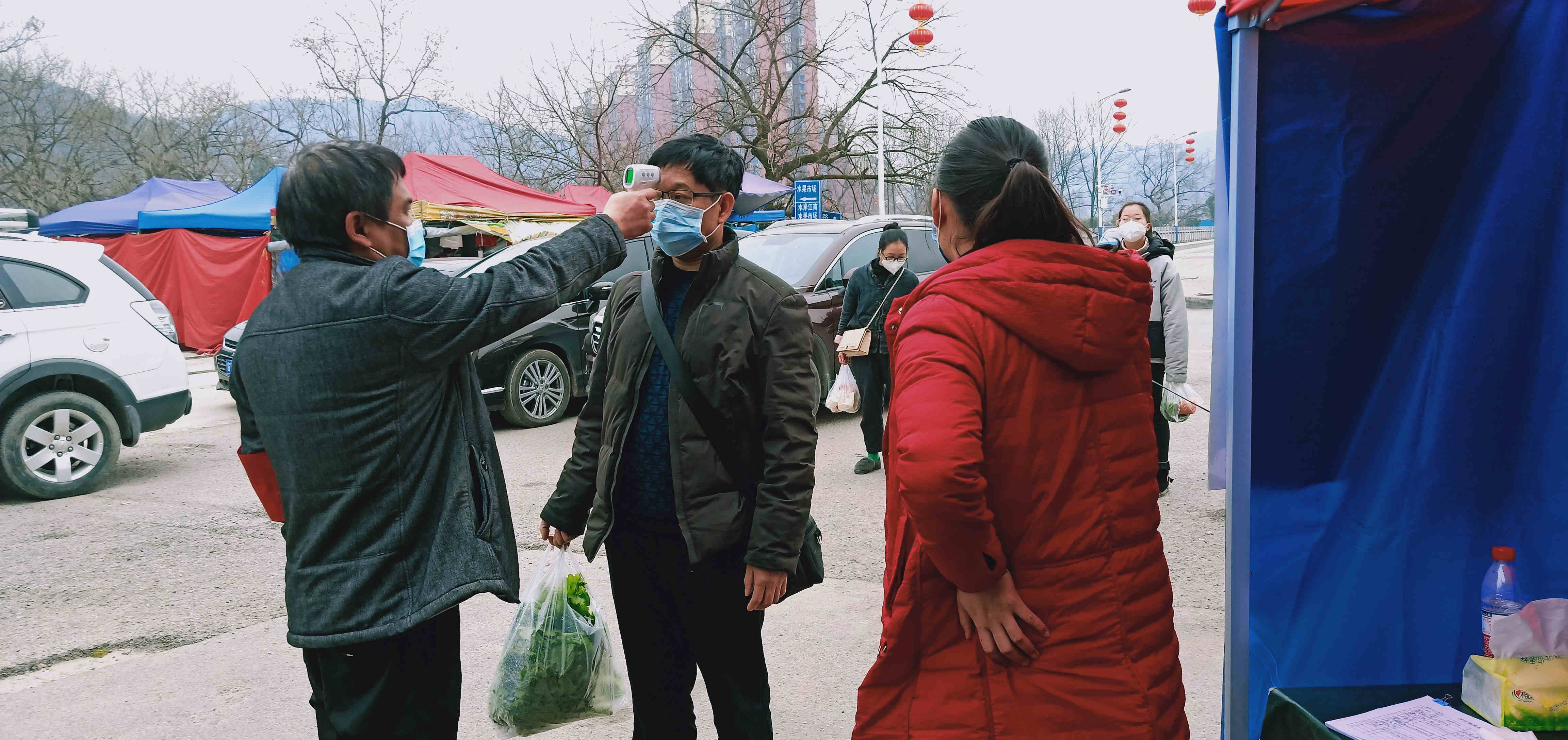 楊榮(左一)在社區防疫監測點為群眾測體溫