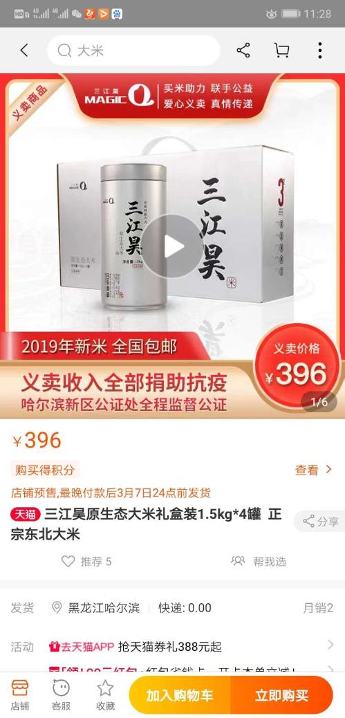 打開手機淘寶,記者看到在天貓商城三江昊米業旗艦店,標價396元一箱的義賣大米已經成交2單。據介紹,義賣活動在天貓商城三江昊米業旗艦店及京東商城兩家電商平台進行,為期一個月,即2月22日0時至3月22日24時。在活動截止日期之前,如果5000萬元的大米全部銷售完,則宣布活動結束;活動日期屆滿,尚未全部銷售完,則以實際銷售額為準。(張桂英 張曉磊)