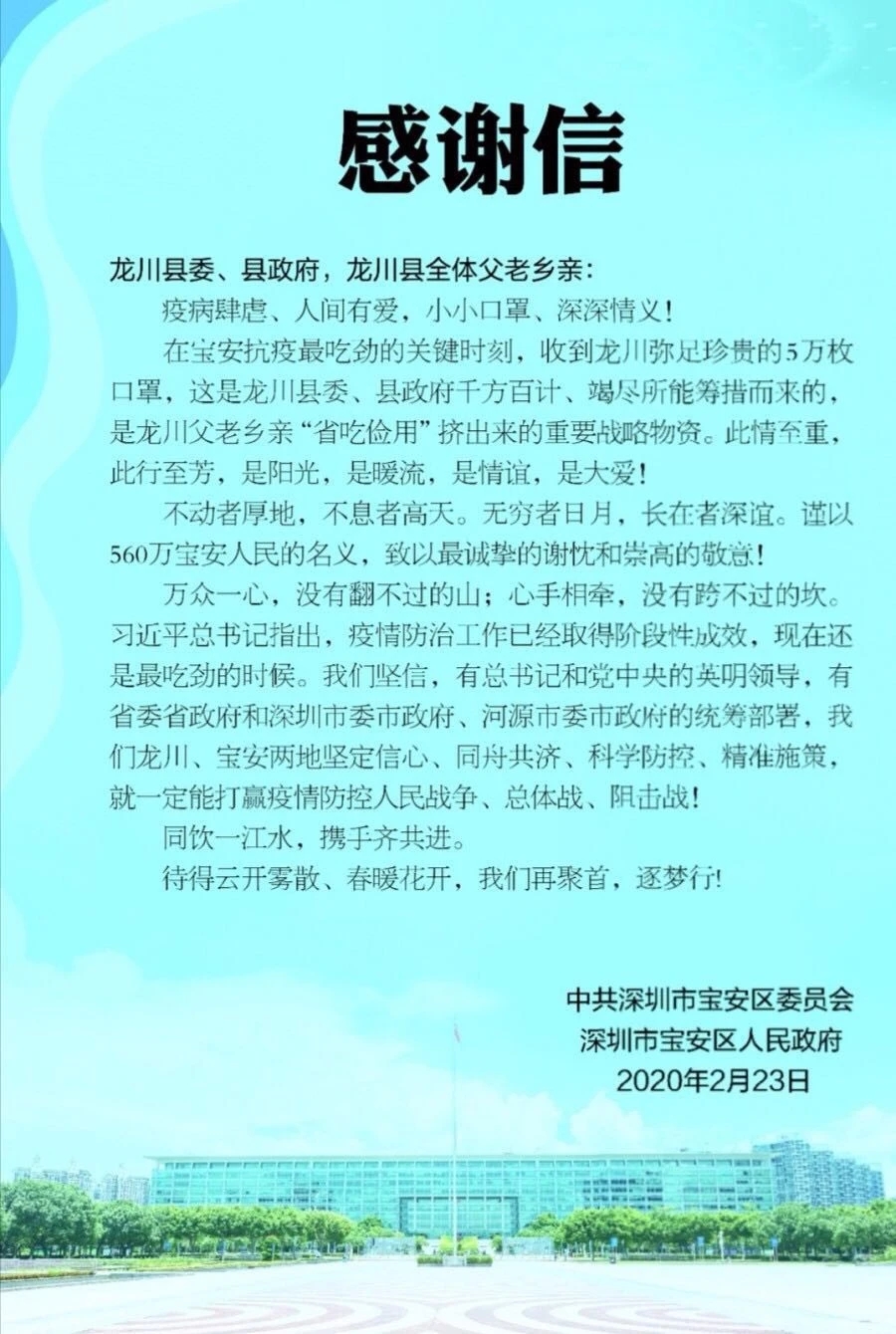 【香港商報網訊】近日,在疫情防控工作關鍵時期,廣東省河源市龍川縣收到了來自深圳市寶安區委員會、深圳市寶安區人民政府發來的感謝信,5萬口罩傳遞寶安龍川兩地情。