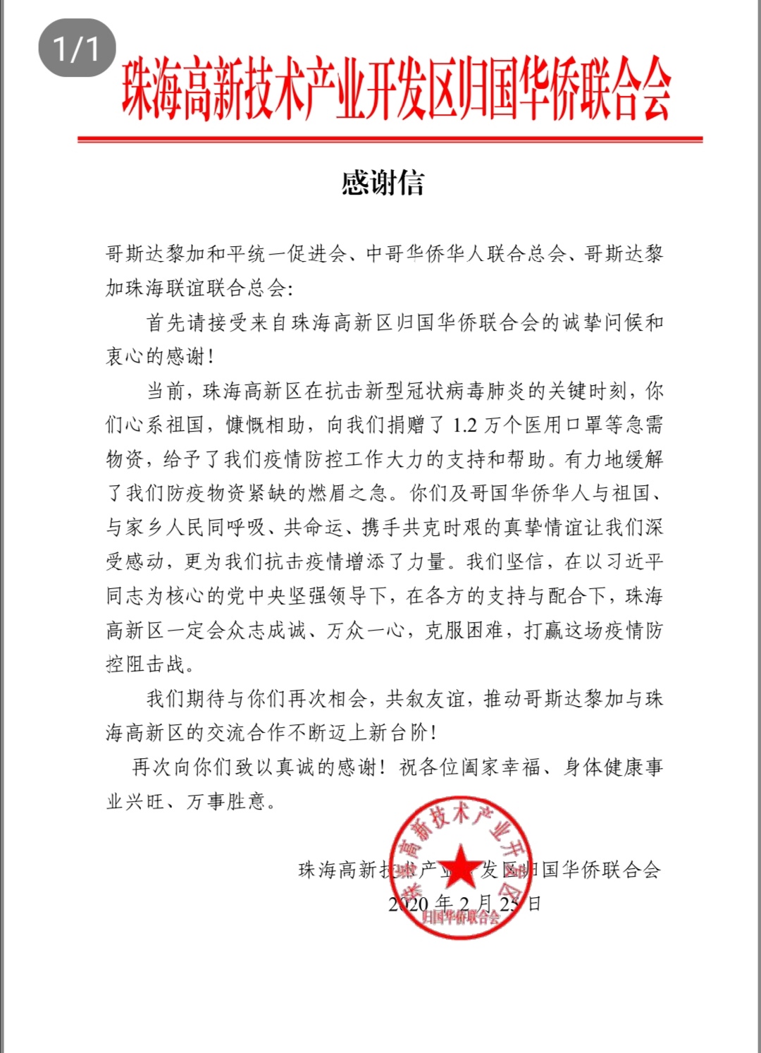 【香港商報網訊】記者 盛芳龄 報導:「我們在一起,打贏疫場仗」國內新型冠狀病毒疫情牽動千千萬萬個華僑華人的心,哥斯達黎加中國和平統一促進會、中哥華僑華人聯合總會、珠海聯誼聯合總會,得知國內急需大量防疫搞疫醫療物資時,在貨源短缺的情況下,千方百計,克服困難,以時間換空間,第一個指標10萬個口罩於2月5日採購籌集到位,及時寄往祖國最需要的地方。2月25日,受到捐助的珠海高新區歸國華僑聯合會,發出感謝信,感謝他們心繫祖國,慷慨相助,向珠海高新區捐贈了1.2 萬個醫用口罩等急需防疫物資,解燃眉之急,助力當地疫情防控。感謝信全文如下: