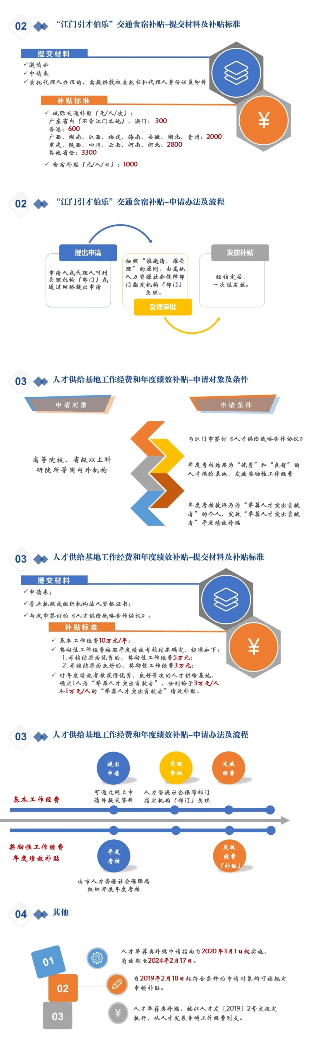 為推動復工復產有序進行,近日,江門市人社局、市人才工作局聯合印發《關於印發人才舉薦類補貼申請指南的通知》,(以下簡稱指南)依據指南無論是海外服務工作站等人才服務機構還是經營性人力資源服務機構或者個人(不含江門市機關事業單位工作人員)每成功推薦一名符合條件的頂尖人才,最高可獲30萬元獎勵,以加大力度引進各類產業人才,鼓勵社會力量舉薦人才。指南圖解如下:(盛芳齡 謝元春 江人社宣)