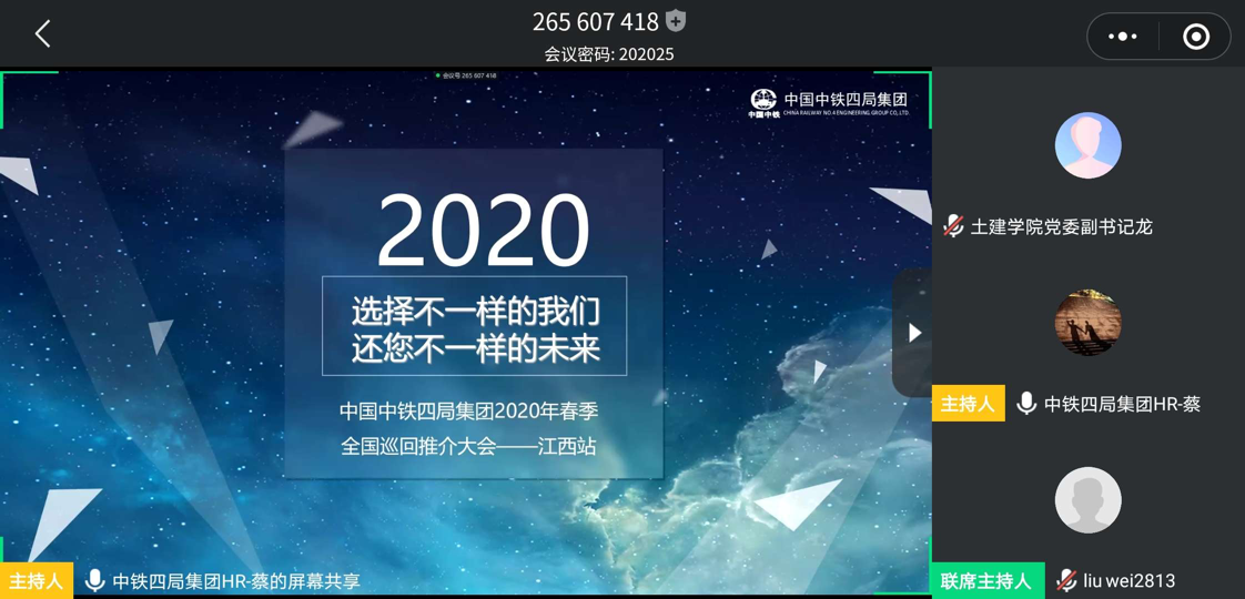 2月24和25日兩天,該校土建學院率先面向企業和學生推出「雲雙選」服務,受到了學生和用人單位的一致好評。華東交大土木(城軌)專業的應屆畢業生伍軍剛參加完中鐵大橋局集團有限公司的「雲雙選」後表示,突如其來的疫情讓我很擔心畢業前找不到工作,沒想到學校推出了「雲雙選 」,就在自己家中進行網上雙選會,「效果挺好,為學校點贊!」