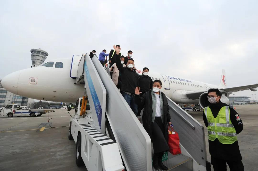 搭載161名復工人員的東航MU7718航班飛抵南京祿口國際機場(陳劍/攝)