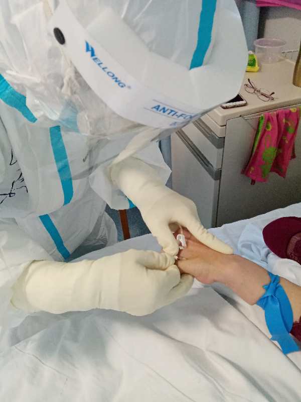 11時45分患者突發心悸、氣緊,我們立即通知醫師,給予硝酸甘油1片舌下含服,效果不佳。中午我發完飯查房時,發現患者情緒不穩定,正用微信哭著跟家人說遺願。我心裡一緊,一方面我察覺到患者情緒的巨大起伏,他由對疾病的焦慮漸變為感覺瀕死的恐懼,不穩定的情緒會影響他的治療。另一方面他脆弱無助的樣子也讓我深深心痛。我立刻走上前用堅定而又緩慢的語氣對他說:“叔叔,你的病情並不是這裡最重的,你的年齡也不是這裡最大的,不要難過,要有信心,只要我們不放棄,堅持下去就會成功!我們和你在一起!你們的康復就是我們最大的心願!”他輕輕地點了點頭,但眼淚還是像斷了線的珠子一直往下掉。此時,我不由自主地伸出雙手上前給了他一個擁抱,他輕輕地推開我哽咽地說:“請你離我遠一點。”