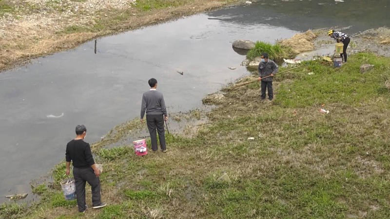 呈坎村村幹部、義工和志願者組成的隊伍正在對村中眾川河垃圾雜物進行清理