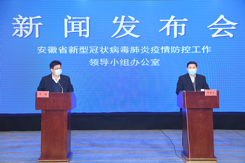 新聞發佈現場,安徽省委宣傳部新聞發佈處處長武瀟(左)主持發佈會,省發改委副主任胡再生介紹相關情況並答記者問(劉玉才/攝)