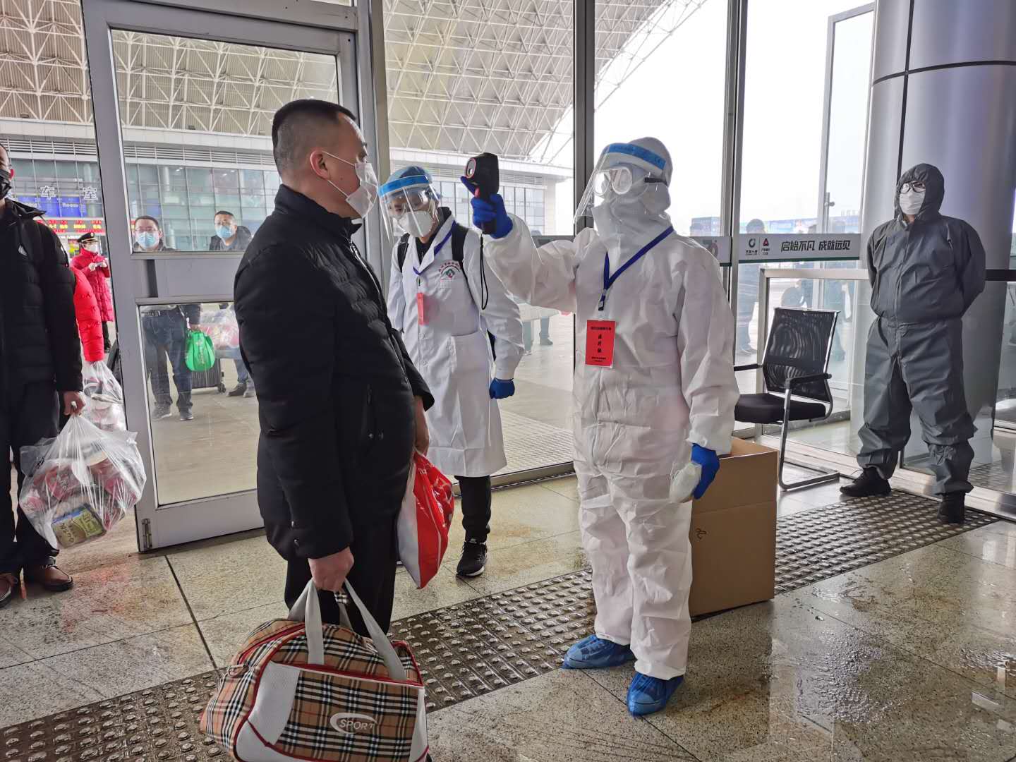 醫護人員給返朔職工測量體溫