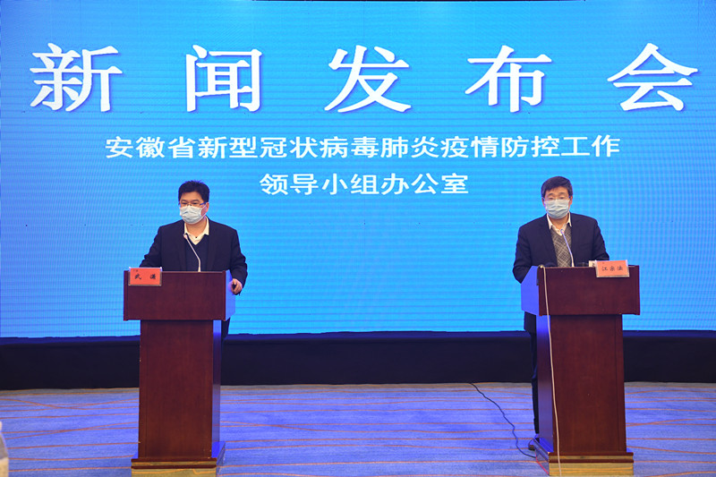 新聞發佈現場,安徽省委宣傳部新聞發佈處處長武瀟(左)主持發佈會,省交通運輸廳副廳長江宗法介紹相關情況(劉玉才/攝)
