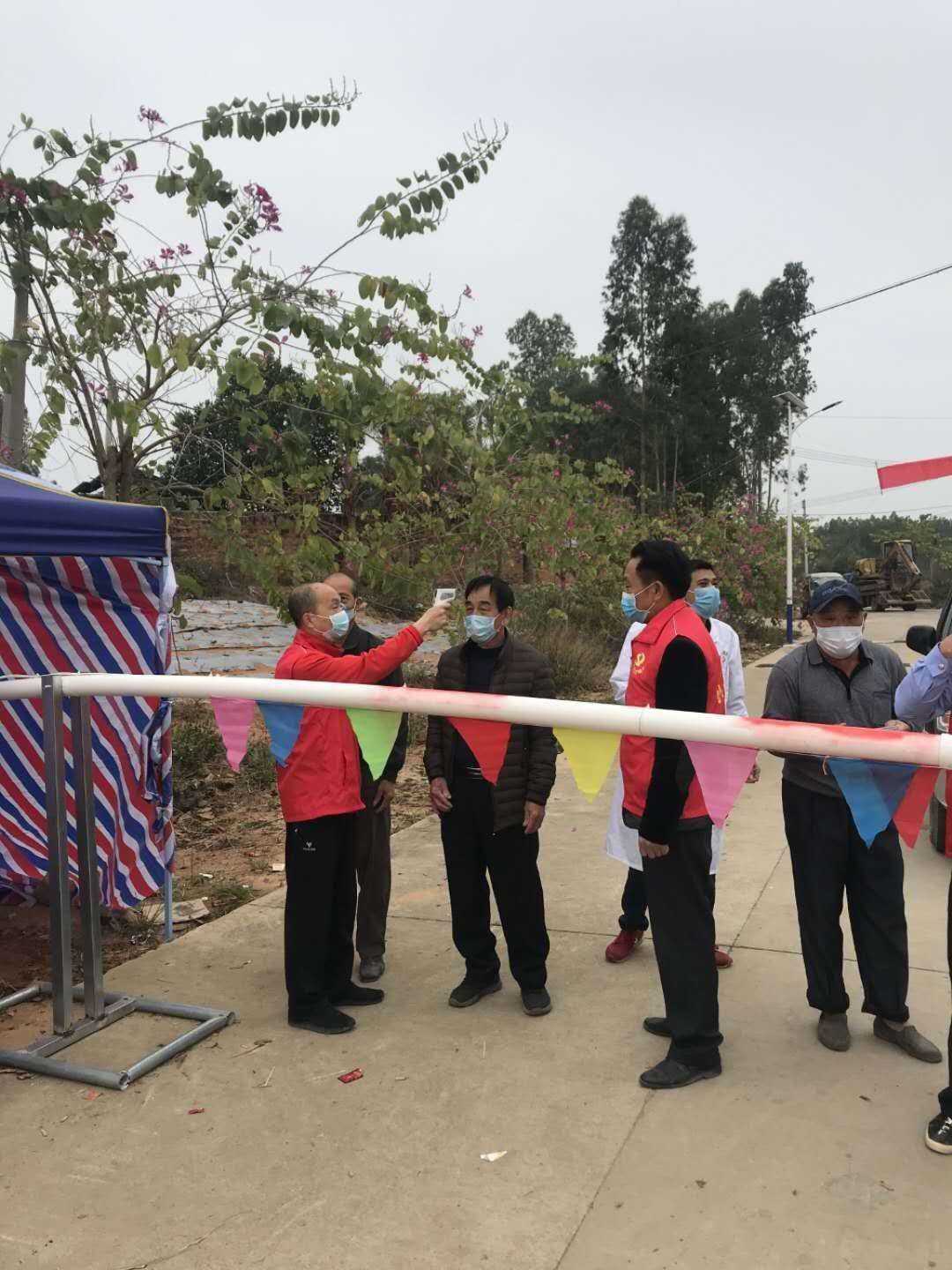 馮偉智在扶貧村的路口監測往來人員體溫