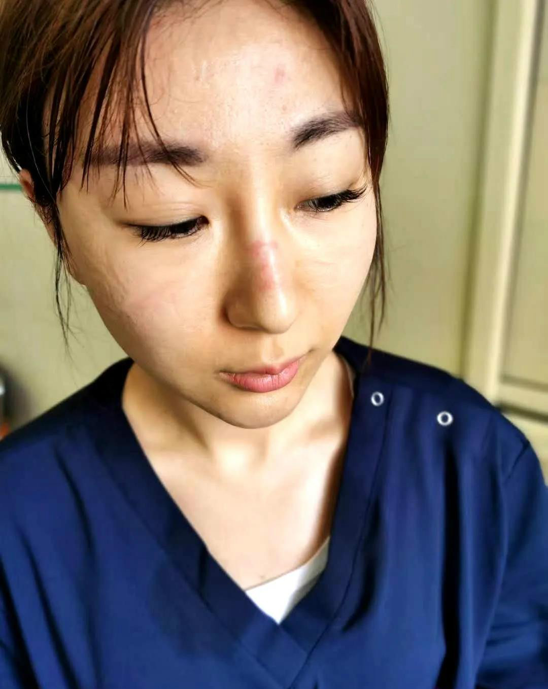 視頻中,細心的人會發現,孫海鑫的臉上有一道深深的痕迹,「那是我們一線醫護人員特有的『妝容』。」孫海鑫打趣道,由於長時間穿戴防護用品,臉上摩擦出一排排白色小膿點,破了結痂,反反覆復,留下一條色素沉積的印記。