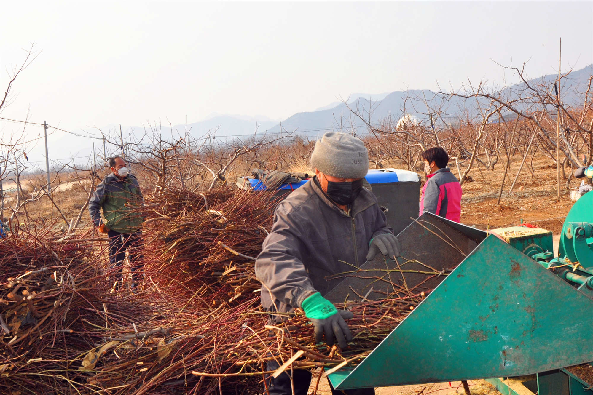 村民將廢棄桃樹枝運往生態橋工程加工粉碎後製成菌棒換回使用