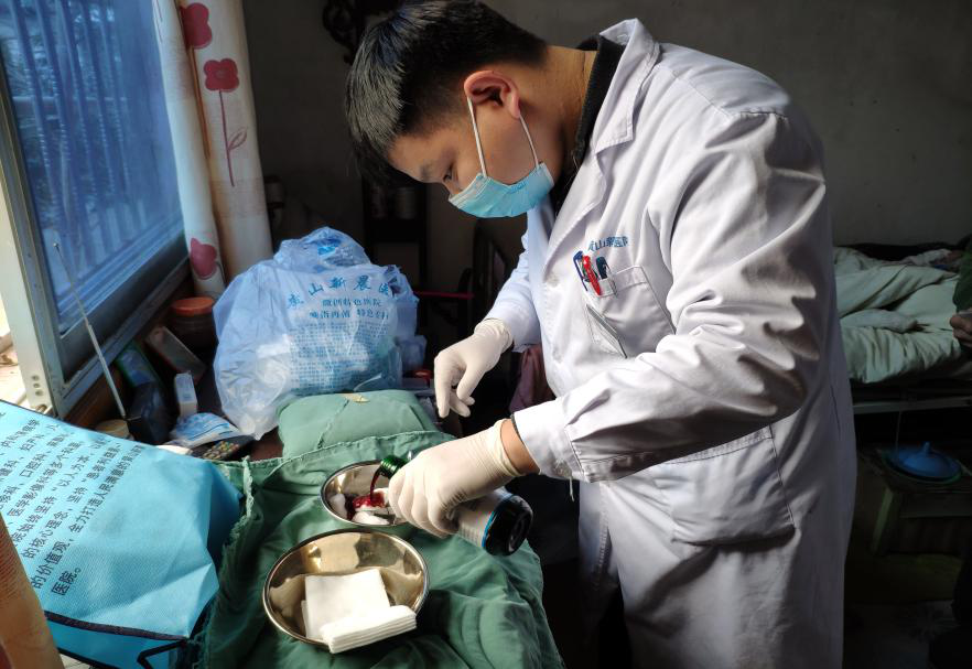鮑德金的兒子因殘疾長年臥床,為最大程度的方便患者就醫,在瞭解完該戶所需藥品後江玨珩立即將情況回饋至鎮扶貧工作站,當日下午區內的新晨醫院的專業醫護人員便攜帶藥品和檢查設備來到鮑德金家中,為他檢查身體,送藥上門。