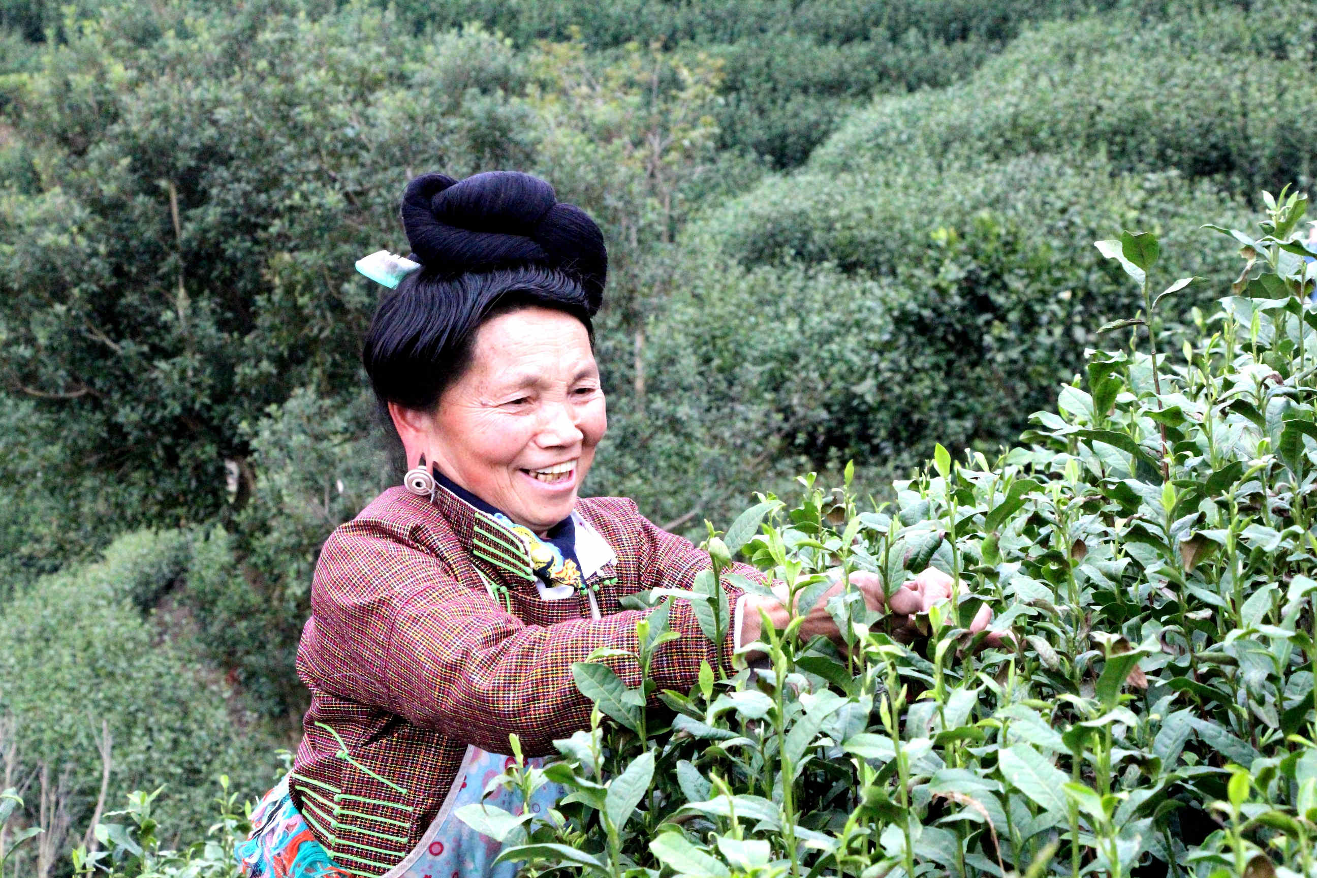 在雷山縣大塘鎮也耶村海拔約900米的茶葉基地上,只見幾十名採茶工人忙着採摘春茶。連綿起伏的茶山上萌發片片嫩綠的新芽,像披上了一層綠衣,遠處還不時傳來悠揚的苗歌。