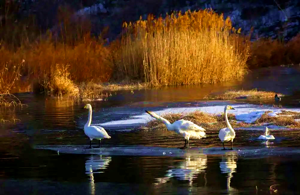 在密雲水庫里,綠頭鴨、各類秋沙鴨在蘆葦盪里嬉戲、覓食;高傲的蒼鷺單腿站立於枝頭巍然不動,只在捕食的時候展翅俯衝,用最漂亮的身姿顯示自己的與眾不同;優雅的白天鵝,周身羽毛白如雪,它們三五成群,在波光粼粼的水面上姿態輕盈地游來游去;還有國家一級保護動物中華秋沙鴨也現了身,在庫區里玩耍。