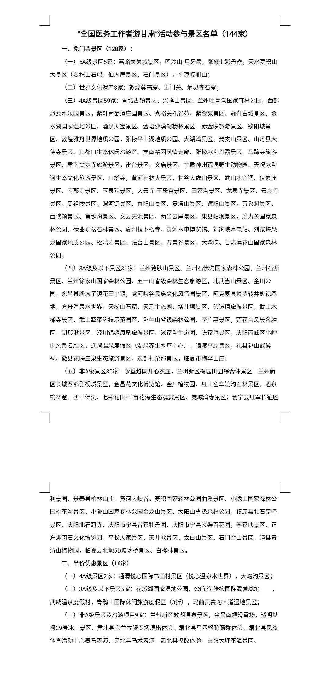 “全國醫務工作者遊甘肅”活動參與景區名單