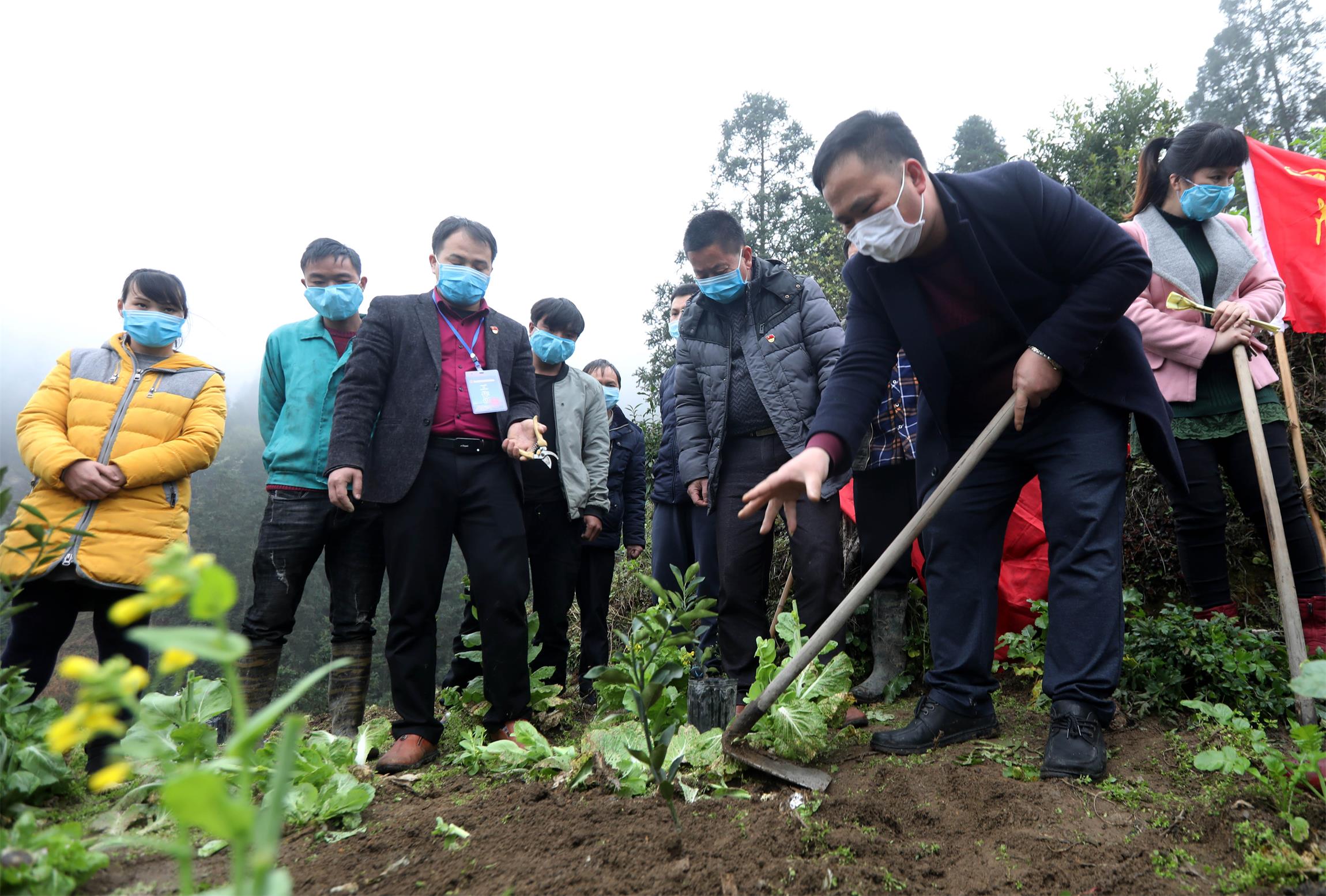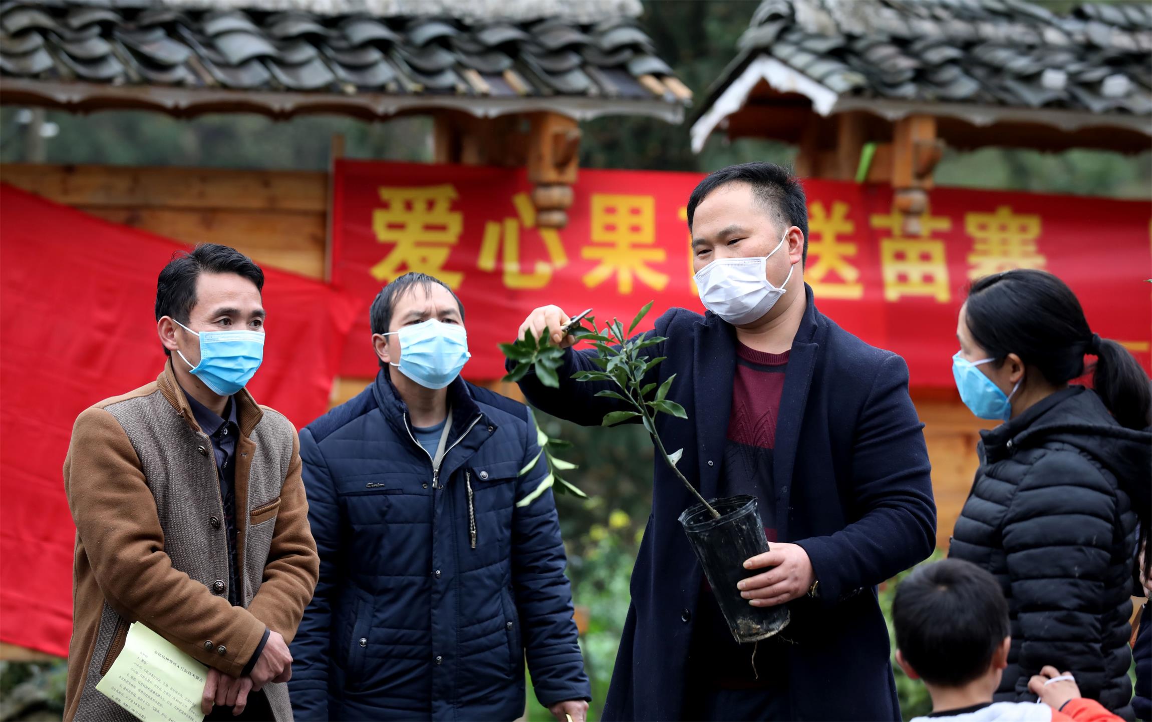 3月2日,在廣西柳州市融水苗族自治縣桿洞鄉黨鳩村烏英屯,廣西柳州市融安縣愛心人士楊進益給苗寨貧困群眾講解融安金桔苗修剪技術 覃慶和攝