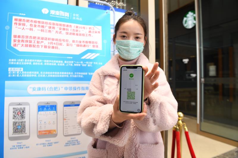 【香港商報網訊】3月4日,位於安徽省合肥市包河區境內的濱湖銀泰商場率先在全市推行安康碼「綠碼通行」,即實行體溫檢測合格+「綠碼通行」疫情防控模式。進入商場的顧客必須先下載安康碼,憑出示「安康碼」綠碼和測量體溫正常後,方可有序進入商場。