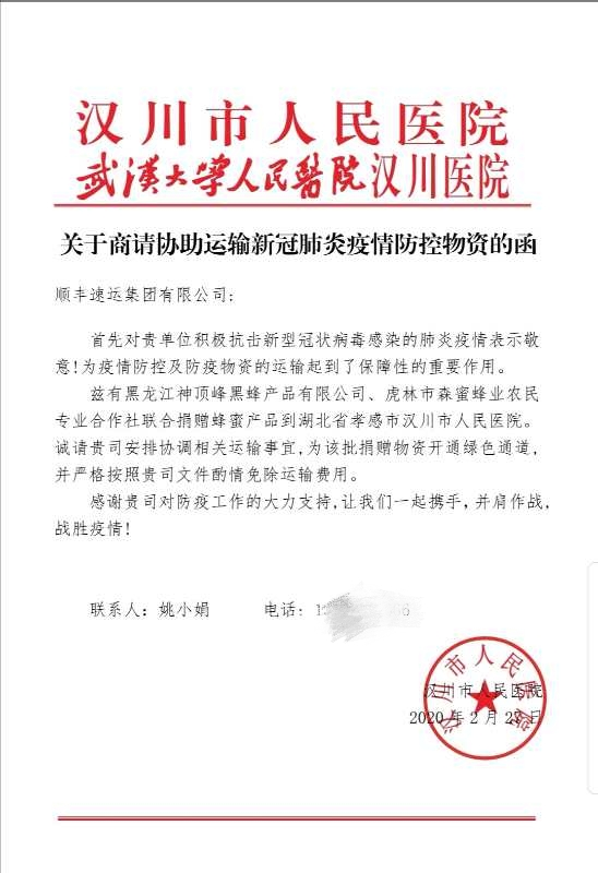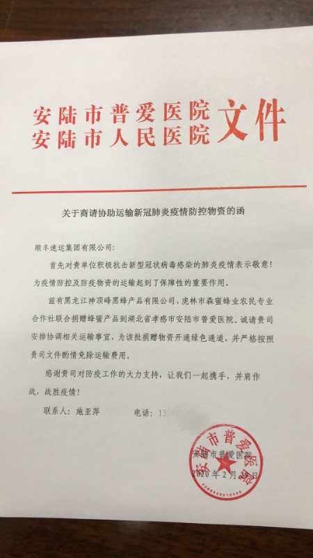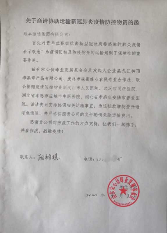 據悉,宋心仿基金會宋心仿理事長、中國蜂盟代表孫敘,積極對接武漢一線醫院,已經協助對接武漢和孝感等地4家醫院和黑龍江省醫療隊,並收到接收函。通過雞西市工商聯聯繫黑龍江赴武漢和孝感的醫療隊,定向落實捐贈支持黑龍江省家鄉支援武漢防疫醫療隊,完成捐贈蜂蜜任務。