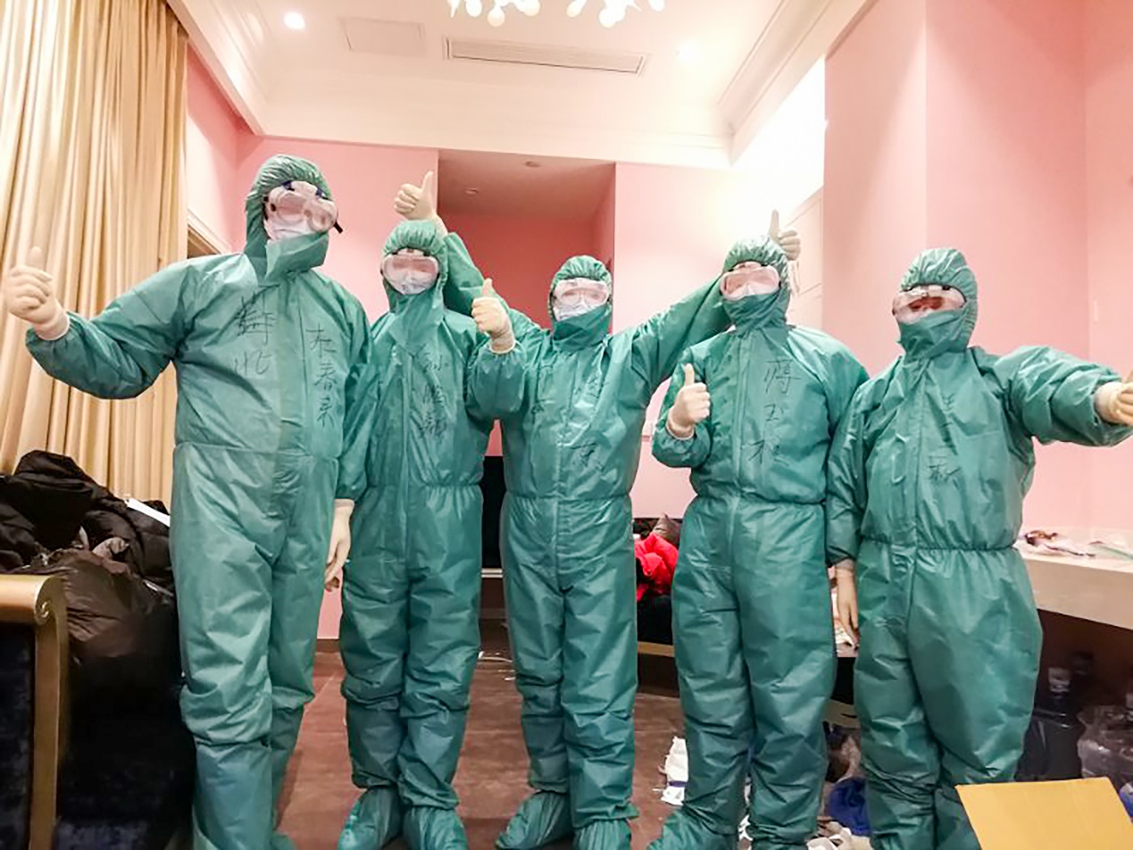 王亞秋(右一)、趙彥東(右三)在武漢江岸方艙醫院支援