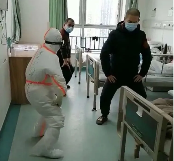 當天,在對走廊和傳染病房進行消毒工作時,田洪美聽到17床李姓患者跟16床的饒姓患者吐槽,想出去活動活動卻不能出去。她推門而入,用徵詢的口吻問:「教你們打八段錦,如何?八段錦由八個動作組成,簡單易學,可以使氣機流暢,骨正筋柔,對增強體質,調節人體各臟腑經絡氣血的運行均有顯著效果,對新冠恢復期的氣機調理極為有益,是祖國醫學傳統的養生法之一,而且不受年齡限制!」