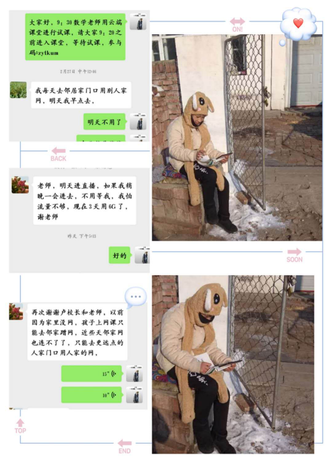 雙城區單城鎮中心學校三年一班的姜欣悅,父母多病,是建檔立卡的貧困學生。因疫情原因,學校組織開展線上教學,可是購買流量這筆額外的支出是這個入不敷出的家庭無力承擔的。假期老師布置活動,拍照上傳,孩子積极參与,都是媽媽拍完,把手機拿到外面,蹭鄰居家的wifi完成的。「我要上課!」「孩子不能落下!」於是媽媽給姜欣悅穿上厚厚的棉衣,一步步追尋着信號,在離鄰居最近,信號稍微穩定的地方,攤開書本,進入班級的網上課堂。孩子滿面笑容,忘卻了周圍的春寒料峭,雪冷風大。凍手了,搓一搓,腳麻了,跺一跺。