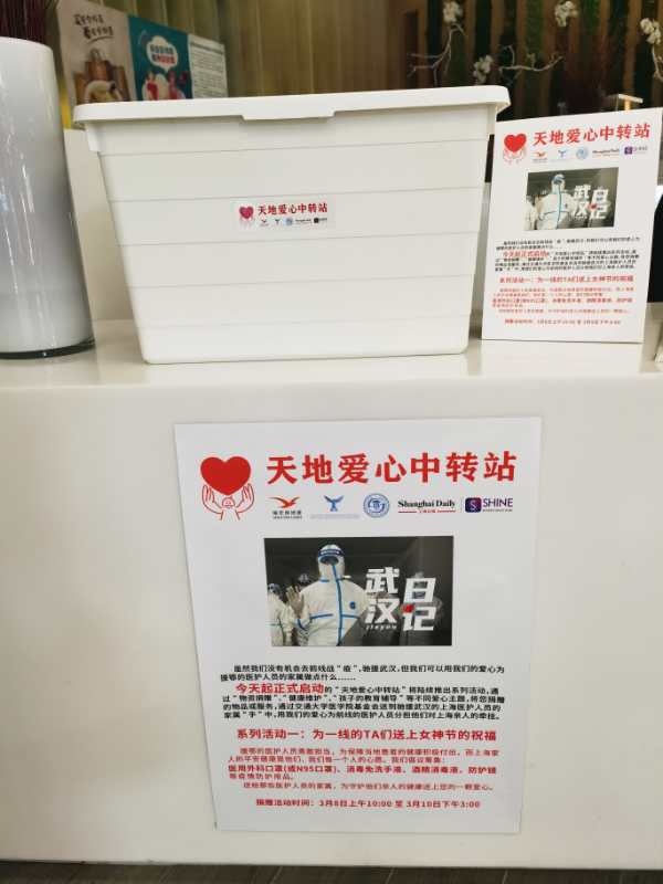 據稱,自新冠肺炎疫情發生以來,上海派出精銳醫務人員奔赴武漢,他們是兒女、是父母,對家庭亦有最柔軟的牽掛。志願者們從交通大學教育發展基金會醫學分會獲悉目前這些白衣戰士們的家屬在生活中面臨防疫物資短缺等問題。「天地愛心中轉站」隨即通過上海日報新媒體平台SHINE向全市讀者發起募集口罩、免洗洗手液、護目鏡的倡議。