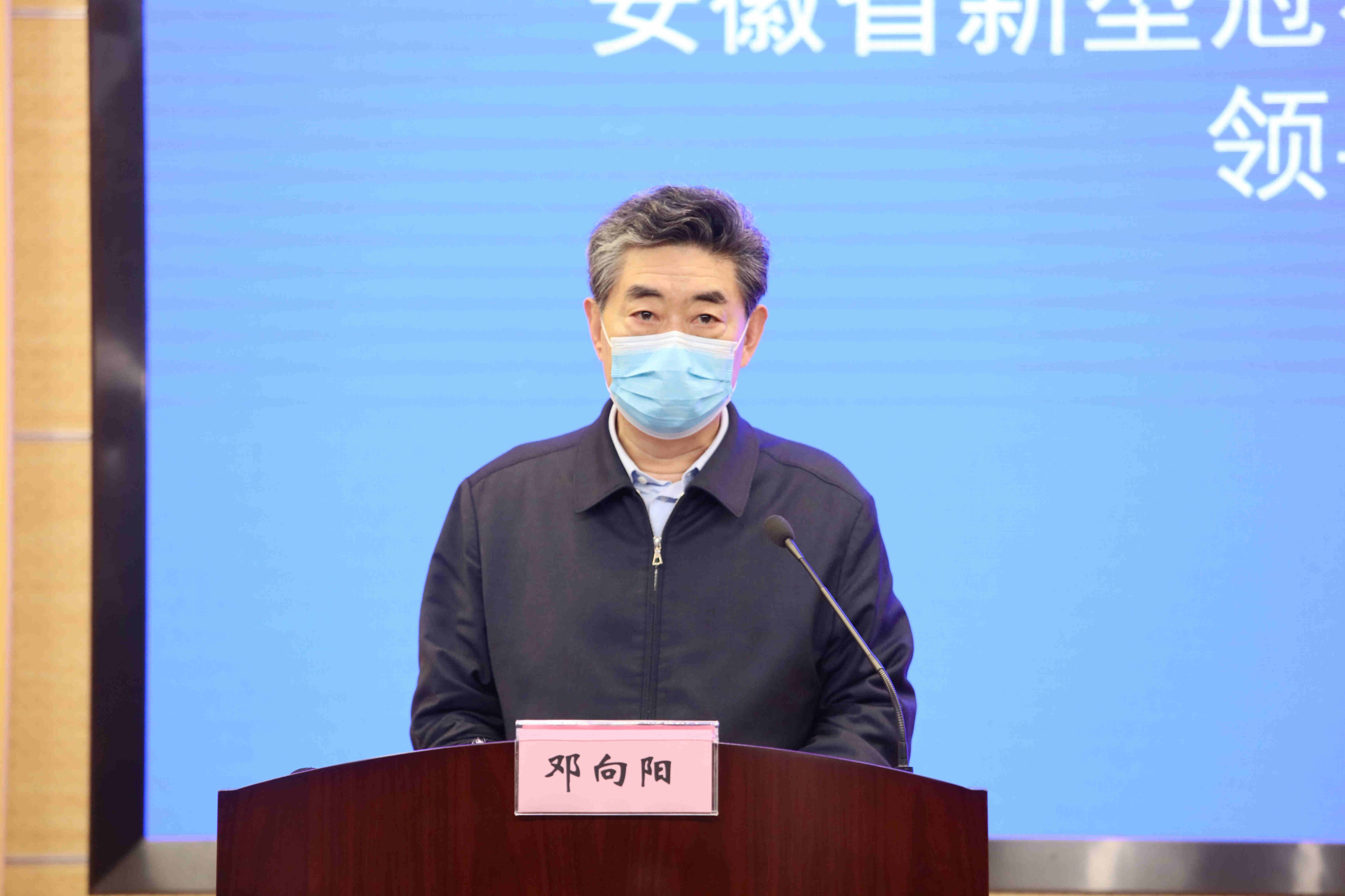 安徽省新冠肺炎疫情防控工作新聞發佈會現場。省委常委、常務副省長、省疫情防控工作領導小組常務副組長鄧向陽介紹相關情況(劉煒鑫/攝)