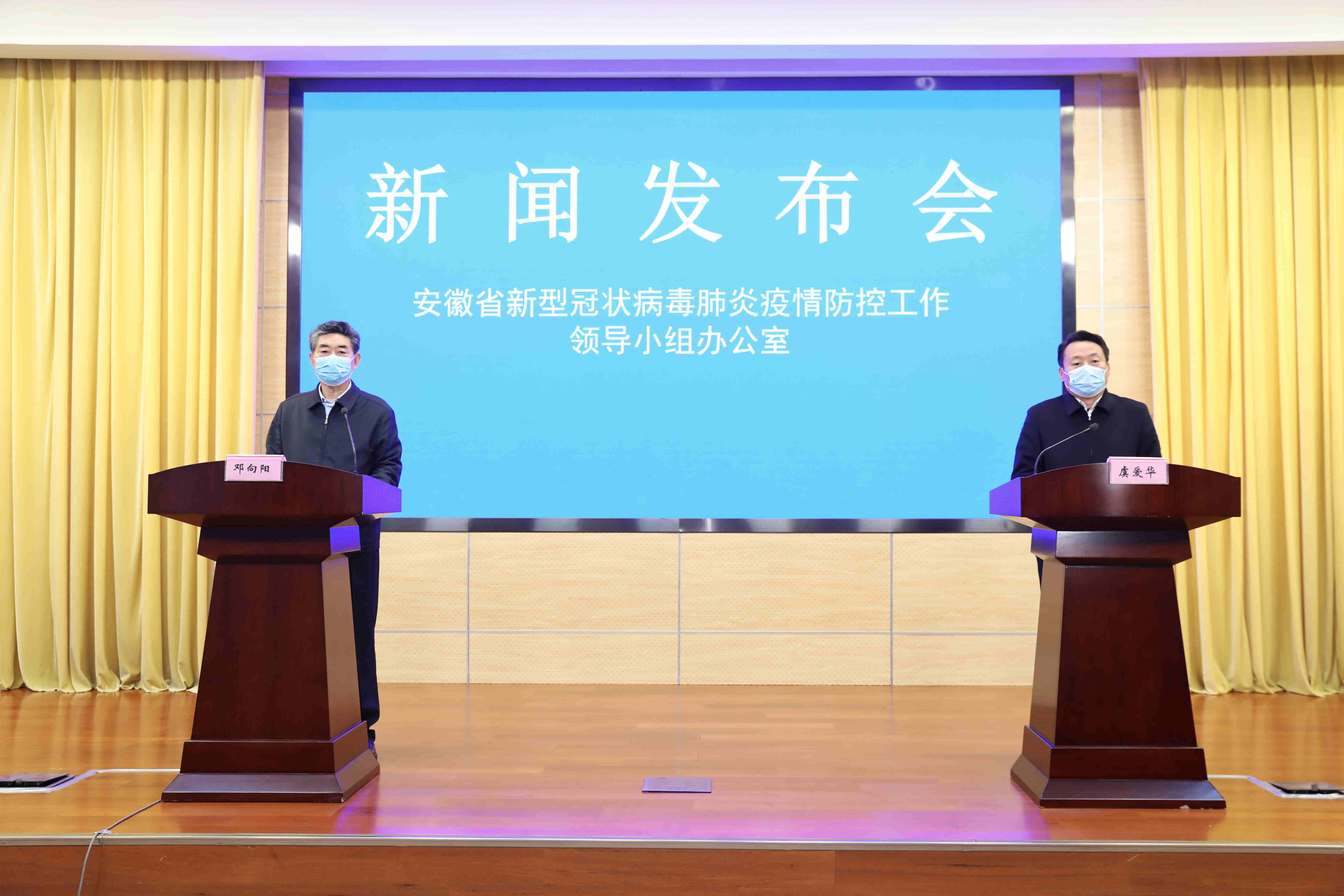 安徽省新冠肺炎疫情防控工作新聞發佈會現場。省委常委、常務副省長、省疫情防控工作領導小組常務副組長鄧向陽介紹相關情況(左),省委常委、宣傳部部長、省疫情防控工作領導小組副組長虞愛華主持(劉煒鑫/攝)