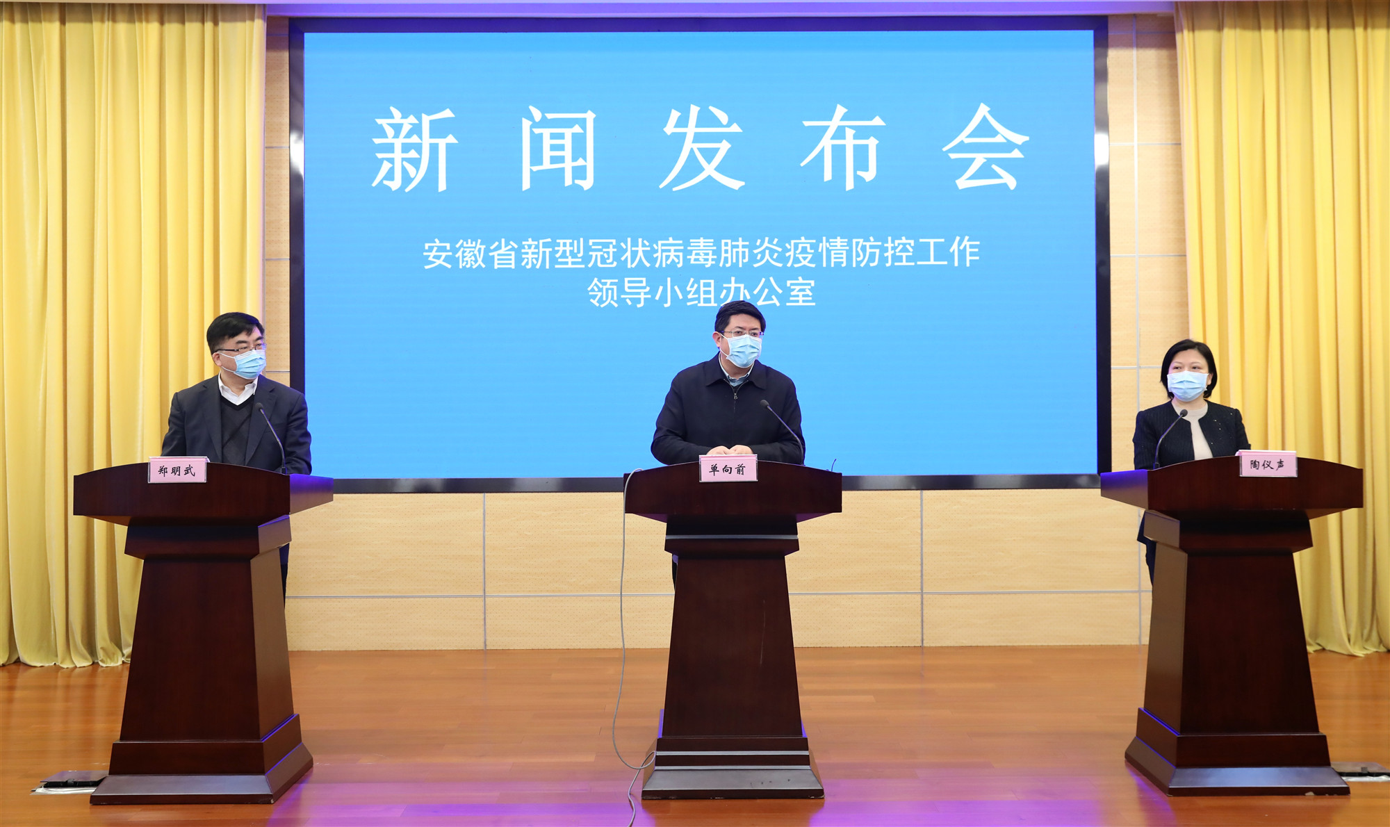 安徽省委宣傳部部務會成員、省政府新聞辦主任鄭明武(左)主持發佈會,省衛生健康委黨組書記、省疫情防控工作領導小組辦公室主任單向前(中)介紹相關情況,省衛生健康委主任、省疫情防控工作領導小組辦公室主任陶儀聲先後回答記者提問(劉煒鑫/攝)