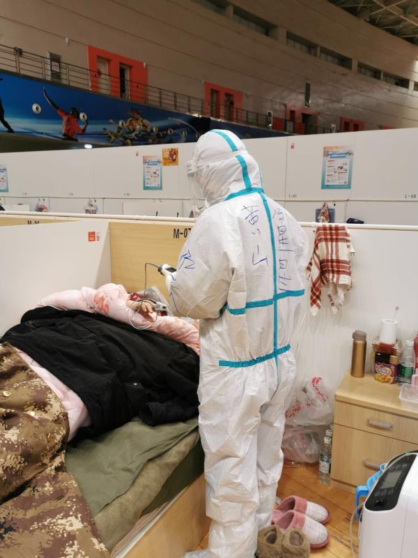 2月19日當得知醫院需要派出醫護人員支援武漢時,她主動擔當、挺身而出,勇當“逆行者”。進入武漢中心醫院後,她服從組織安排,雖然身穿厚厚的防護裝備,但她不敢有絲毫馬虎,時刻以一名共產黨員的標準嚴格要求自己,憑藉豐富的理論知識和嫺熟的操作技能,出色的完成了各項救治工作。“我們是醫務人員,支援武漢是我們義不容辭責任,我們感到很榮幸,頭髮剪了還會長的。武漢加油,中國必勝!”