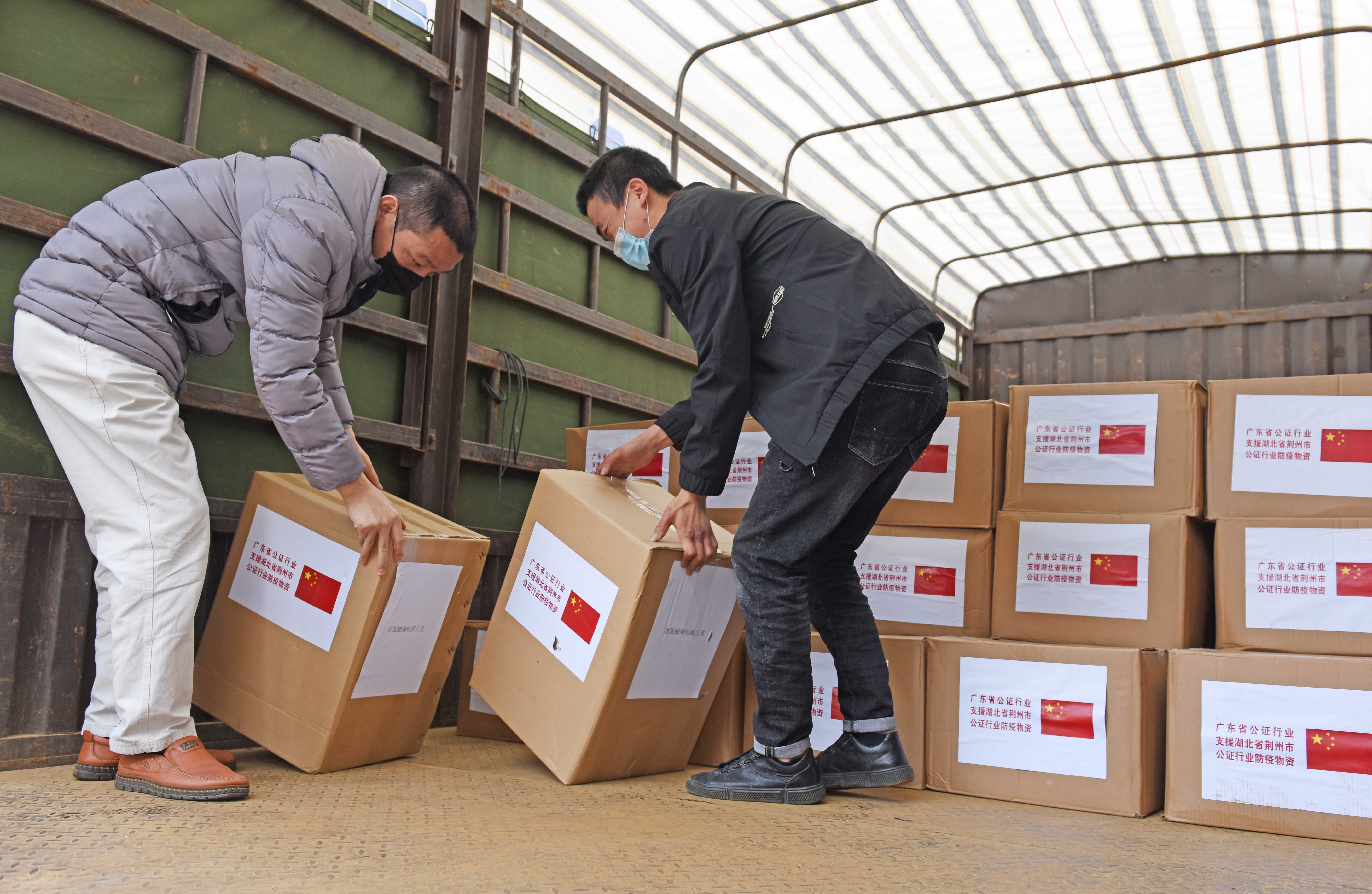 【香港商報網訊】3月10日上午,廣東省司法廳辦公樓前,一輛掛着「湖廣一家親,攜手抗疫情」標語的8噸大貨車,裝載着貼有「廣東省公證行業支援湖北省荊州市公證行業防疫物資」字樣的貨物,工作人員正忙着進行物資清點和搬放。正在做開往荊州的最後準備工作。