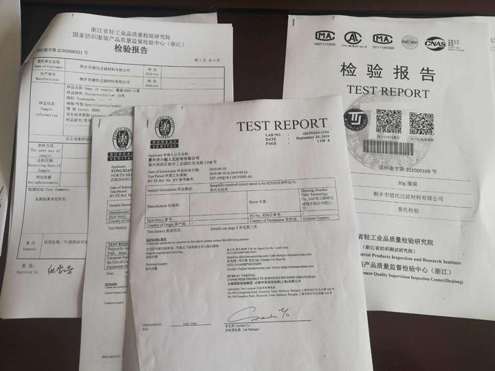 在浙江省、嘉興市和桐鄉市經信部門的協調下,朝暉過濾研製的覆膜材料,迅速通過了浙江省輕工業品質量檢驗研究院、國家紡織服裝產品品質監督檢驗中心(浙江)等專業檢驗機構的檢驗。在檢驗機構出具的檢測報告中,數據為「70度熱水浸泡2小時,自然晾乾後測試,效率保持率在96%以上」。