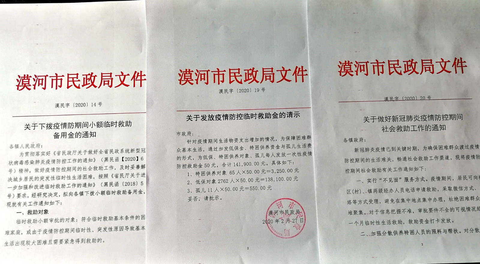 為全面做好睏難群眾的幫扶工作,漠河市民政局與鎮政府、社區建立工作機制,採取微信視頻、電話詢問、入戶走訪等形式對全市孤寡老人、困境兒童、重病重殘人員進行全面排查,建立登記台帳,準確掌握困難群眾的健康狀況和基本生活情況;對分散供養的特困人員實行「一對一」包保服務責任制,及時解決他們的生活困難,讓困難群眾在疫情期間感受到黨和政府的關心關愛。同時,漠河市民政局還採取了「不見面服務」方式,困難群眾可打電話申請救助,由工作人員上門代辦,避免人員在救助大廳聚集,造成病毒交叉感染。截至目前,新納入低保1人,審批臨時救助16人,發放救助金3.3萬元。