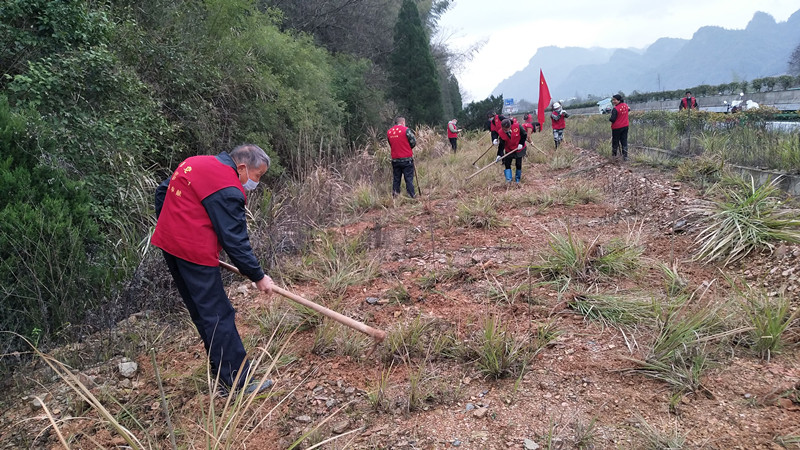 黟縣漁亭鎮考川村綠梅種植扶貧基地裏,黨員們揮動著手中的鋤頭種植綠梅 劉偉攝