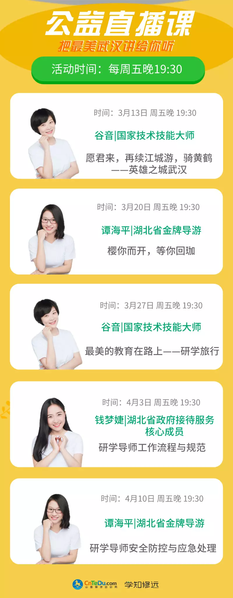 湖北省文化和旅遊廳協同中國旅遊培訓網,邀請一批國家級金牌導遊,為全省旅遊從業人員提供免費在線培訓,接下來1個多月的每周五晚上,還將安排四次高水平的公益培訓課分享。