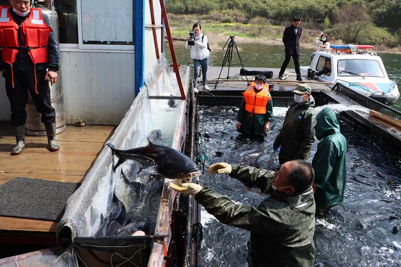 “這批魚在太平湖生長有10年了,個頭大、肉質好。我們要把太平湖最好的有機魚送往武漢。”黃山太平湖漁業公司董事歐陽雲一興奮地說道。