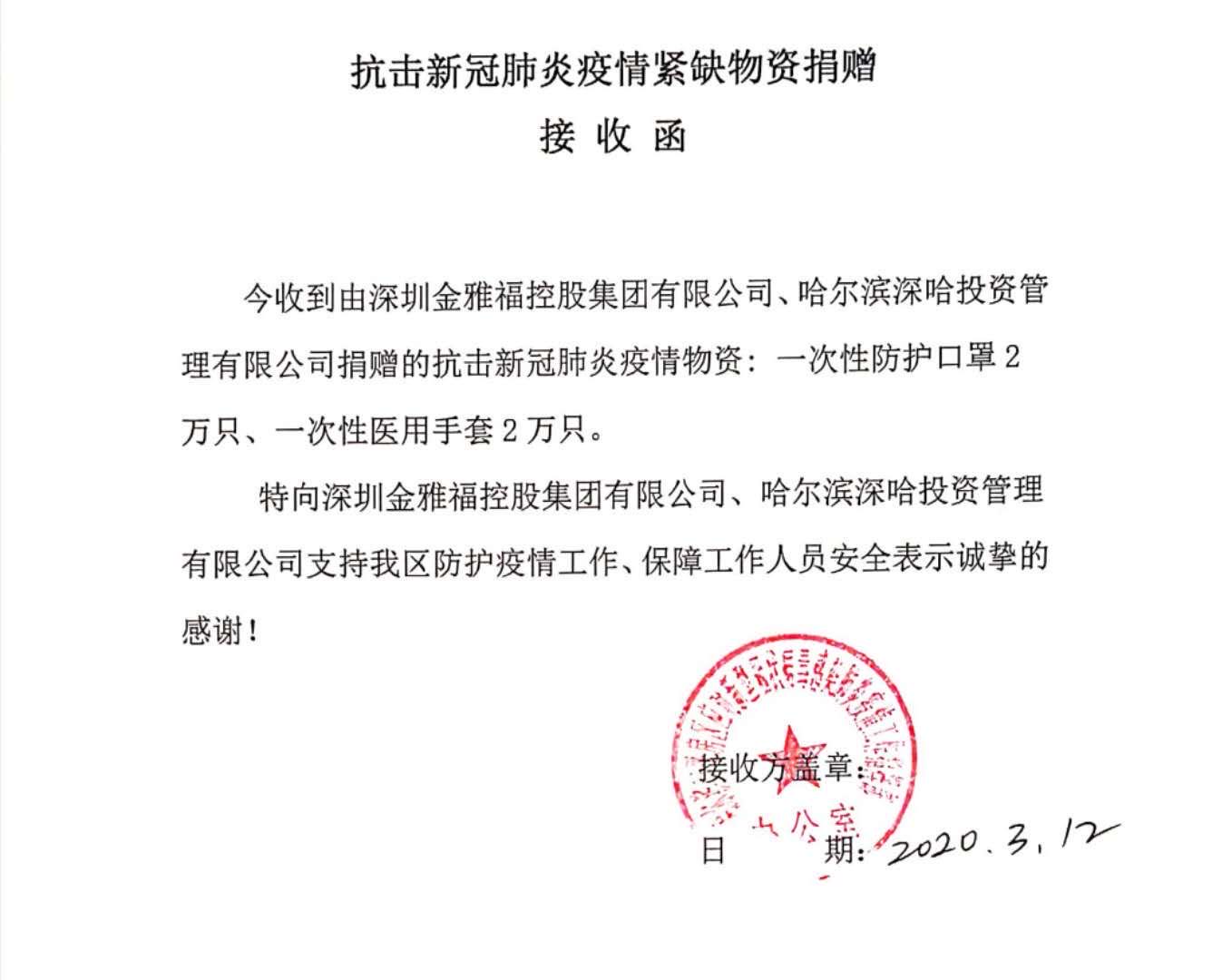 【香港商報網訊】眾志成城抗疫情,攜手同行克時艱。當前,新冠肺炎疫情牽動着每個人的心,全民共抗疫情的關鍵時期 ,深圳金雅福集團聯合深哈投資向哈爾濱市平房區人民政府(經開區)捐贈2 萬個一次性防護口罩和 2萬隻一次性醫用手套,用於疫情防控,助力打贏新型冠狀病毒疫情防控阻擊戰,在疫情防控關鍵時期,擔負起應有的社會責任。