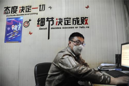 在哈電鍋爐重型容器分廠,記者看到一名身穿防護服、戴着護目鏡的防疫工作人員,正用背複式電動噴霧器進行消毒。分廠內員工均佩戴口罩堅守在崗位上,即使需要多人協作的,大家也盡量保證距離,甚少說話。